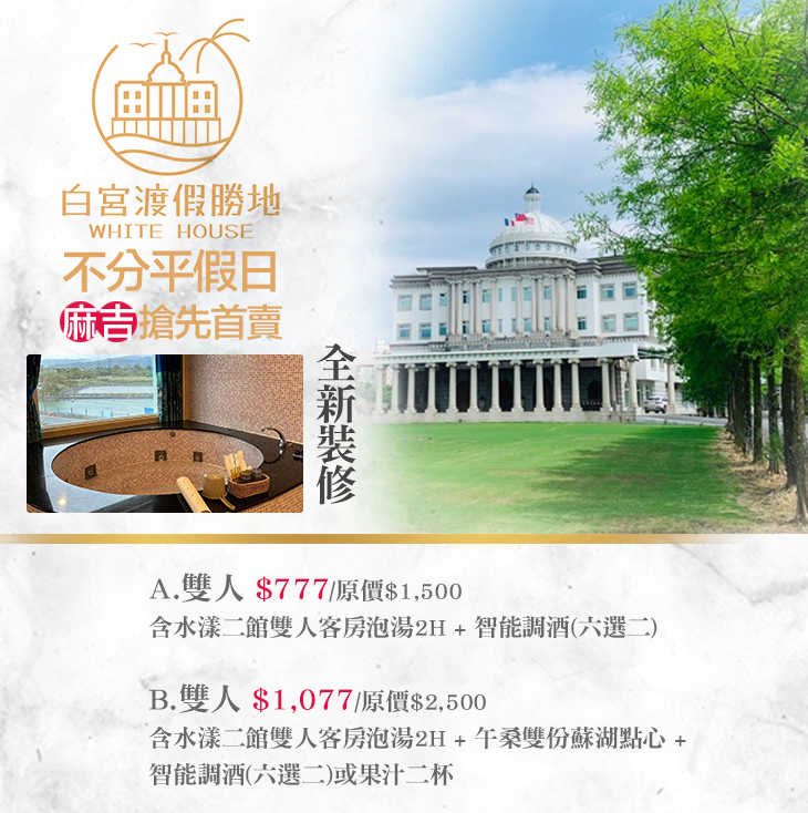 【礁溪White House白宮渡假勝地(白宮主館)】感謝麻吉們熱烈搶購,已全數賣光光。