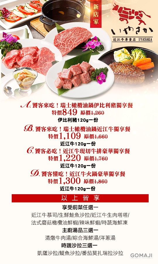 A.饕客來吃!瑞士橄欖油鍋伊比利豬獨享餐 / B.饕客來吃!瑞士橄欖油鍋近江牛獨享餐 / C.饕客必吃!近江牛現切牛排豪華獨享餐 / D.饕客懂吃!近江牛火鍋豪華獨享餐