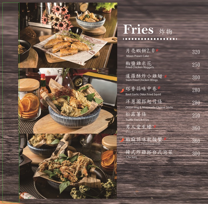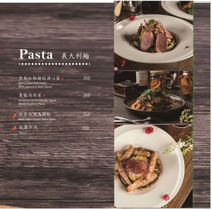 餐點主打燉飯義大利麵,採用無國籍料理做法,如:松露蘆筍麻油雞燉飯和主廚童年背景下的味道傳承 - 台式海鮮薄餅作結合,讓兩種不同風味的餐點,透過巧妙的組合,碰撞出舌尖上的燦爛火花。料理無國界,不單只是食材與食材,更是主廚與顧客之間,交流與認識的主要橋梁。