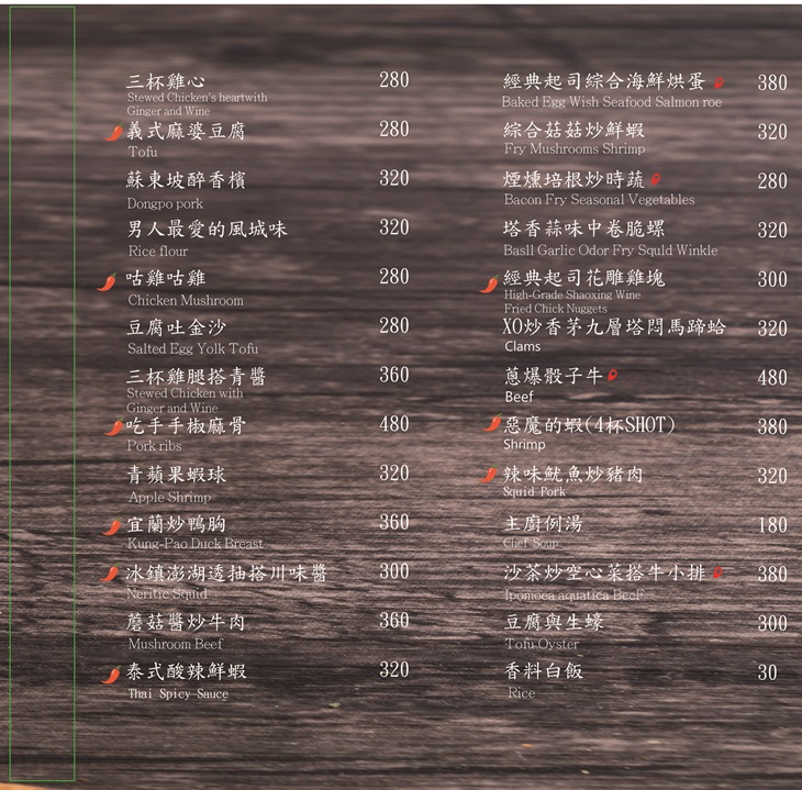 當家常料理 - 三杯雞遇上義式風味青醬,會迸出什麼樣的味蕾驚喜呢?點來試試就知道!爆炒得噴香誘人的三杯雞,肉嫩入味,與主廚特製濃郁青醬相搭,羅勒、蒜頭及洋蔥的香氣,於齒舌間繚繞不已,搭配套餐附上的白飯一同享用,完美無比。