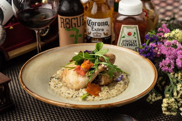 麻香四溢,深受饕客喜愛的人氣料理 - 松露麻油春雞燉飯,烹飪得香噴噴、肉嫩多汁的麻油春雞,皮Q富濃濃麻油香氣,佐上主廚精心烹煮的美味燉飯品嚐,濕軟綿密,色香味俱全,最後搭配精緻美麗的巧手擺盤,讓無國界料理也能大放異彩!