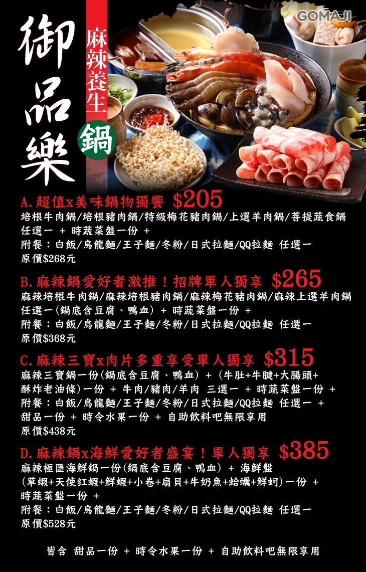 A.超值x美味鍋物獨饗 / B.麻辣鍋愛好者激推!招牌單人獨享 / C.麻辣三寶x肉片多重享受單人獨享 / D.麻辣鍋x海鮮愛好者盛宴!單人獨享