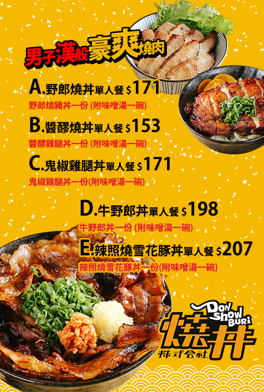 顛覆美食街的刻板印象,燒丼株式會社推出超值感燒肉丼,與日式復刻版店格,絕對誠意十足。拉開厚實木椅,倚身長吧台,來碗現烤燒肉丼,一個人的時光,或者與兩三好友的飽足午晚飯,氣氛對了,美味感動更加倍!