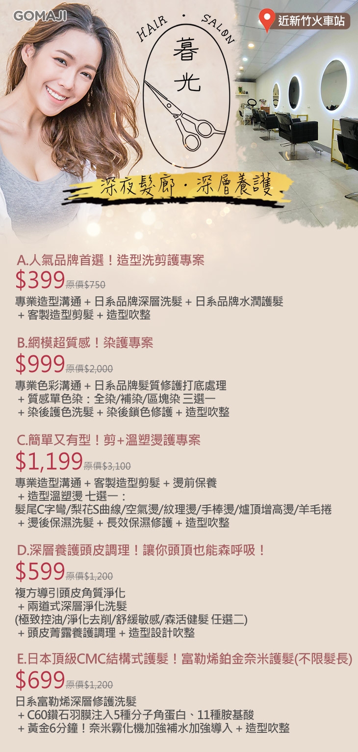 A.人氣品牌首選!造型洗剪護專案 / B.網模超質感!染護專案 / C.簡單又有型!剪+溫塑燙護專案 / D.深層養護頭皮調理!讓你頭頂也能森呼吸 / E.日本頂級CMC結構式護髮! 富勒烯鉑金奈米護髮(不限髮長)
