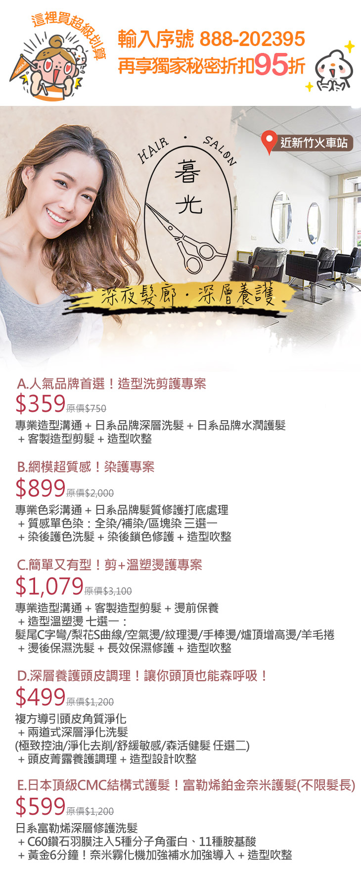 A.人氣品牌首選!造型洗剪護專案 / B.網模超質感!染護專案 / C.簡單又有型!剪+溫塑燙護專案 / D.深層養護頭皮調理!讓你頭頂也能森呼吸! / E.日本頂級CMC結構式護髮!富勒烯鉑金奈米護髮(不限髮長)