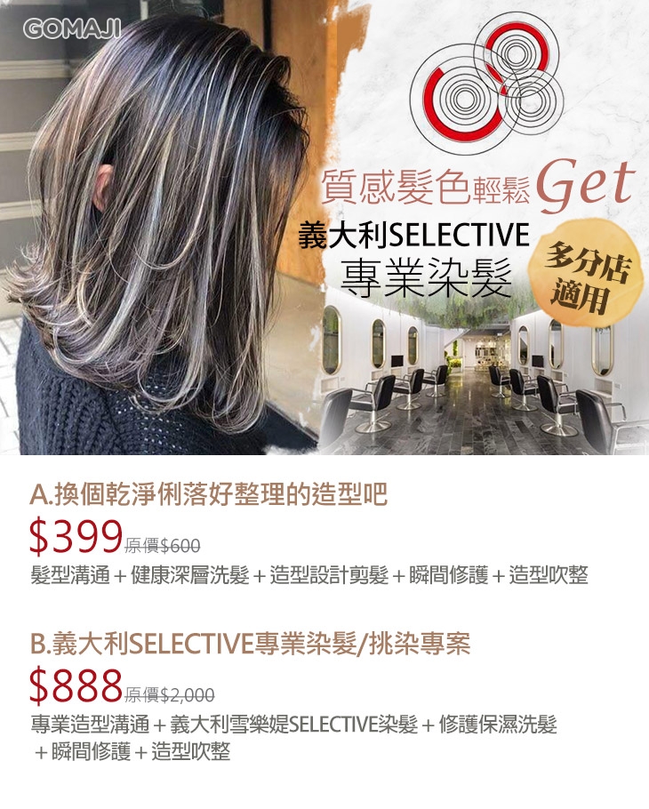 〈專業造型溝通 + 義大利雪樂媞SELECTIVE染髮 + 修護保濕洗髮 + 瞬間修護 + 造型吹整〉
