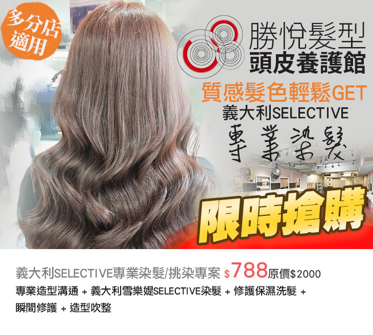 〈專業造型溝通 + 義大利雪樂媞SELECTIVE染髮 + 修護保濕洗髮 + 瞬間修護 + 造型吹整〉