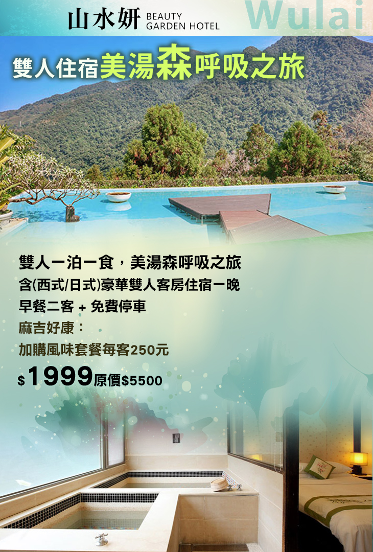 趁著假期和情人一同到【烏來山水妍溫泉會館】親近大自然,享受美湯親膚,一邊眺望烏來的好山好水,享有一個不受外人打擾的私密空間,還有物超所值的經濟實惠價格,想省荷包又想善待自己和呵護另一半就趁現在!