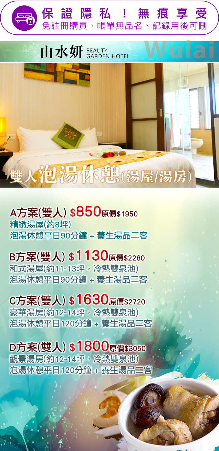趁著假期和情人一同到【烏來山水妍溫泉會館】親近大自然,享受天然化妝水的美湯親膚,一邊眺望烏來的好山好水,享有一個不受外人打擾的私密空間,還有物超所值的經濟實惠價格,想省荷包又想善待自己和呵護另一半就趁現在!