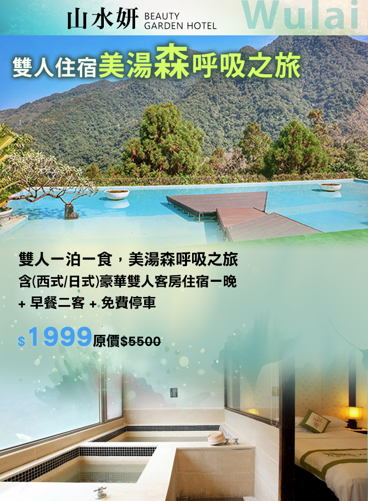 趁著假期和情人一同到【烏來山水妍溫泉會館】親近大自然,享受美湯親膚,一邊眺望烏來的好山好水,享有一個不受外人打擾的私密空間,還有物超所值的經濟實惠價格,想省荷包又想善待自己和呵護另一半就趁現在!