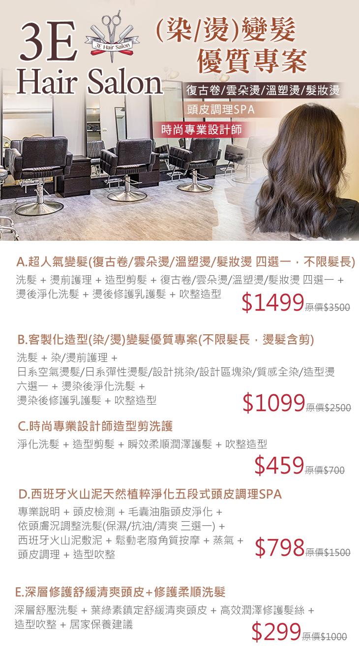 A.超人氣變髮(復古卷/雲朵燙/溫塑燙/髮妝燙 四選一,不限髮長) / B.客製化造型(染/燙)變髮優質專案(不限髮長,燙髮含剪) / C.時尚專業設計師造型剪洗護 / D.西班牙火山泥天然植粹淨化五段式頭皮調理SPA / E.深層修護舒緩清爽頭皮+修護柔順洗髮