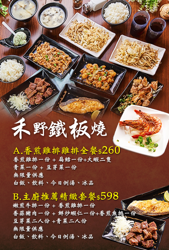 只要260元起,即可享有【禾野鐵板燒】A.香煎雞排雞排全餐 / B.主廚推薦精緻套餐