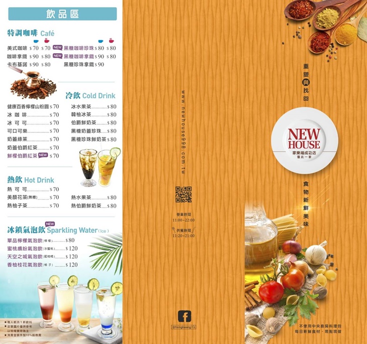 一走進店內,服務生親切的笑容,是 NEW HOUSE 帶給顧客的滿意保證,新生活飲食文化將帶給您另一種生活體驗,讓您在輕鬆、休閒、零負擔的空間內,自在享受!