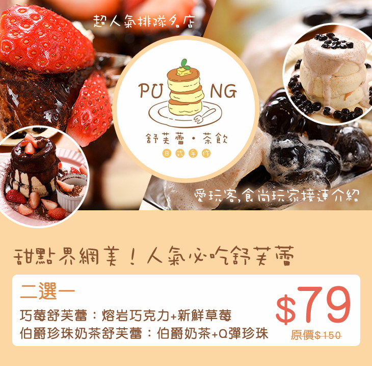美食指標──食尚玩家、愛玩客激推!新竹超人氣排隊名店!【PUNG 舒芙蕾‧茶飲】主打有如雲朵般又鬆又軟的舒芙蕾,還有真材實料的超爆漿甜甜圈,每一道甜蜜蜜的幸福滋味,都是細心手工製作,更為了讓您品嚐到最好的風味,堅持使用最頂級的食材,捨棄人工的化學調味,也不添加任何一滴水,就是要以食物的原汁原味交疊出最完美的美味!恰好的份量、剛好的甜度,讓【PUNG 舒芙蕾‧茶飲】用最好的甜點、最好的茶飲細細撫慰您的身心!