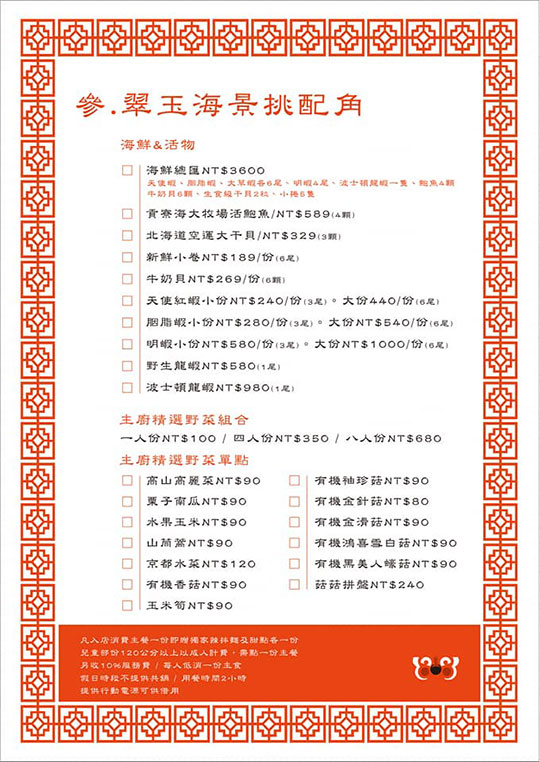 菜色內容依季節時令調整,實際品項、價目依現場提供為主