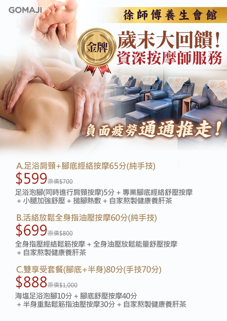 A.足浴肩頸+腳底經絡按摩65分(純手技65分) / B.活絡放鬆全身指油壓按摩60分(純手技60分) / C.雙享受套餐(腳底+半身)80分(純手技70分)