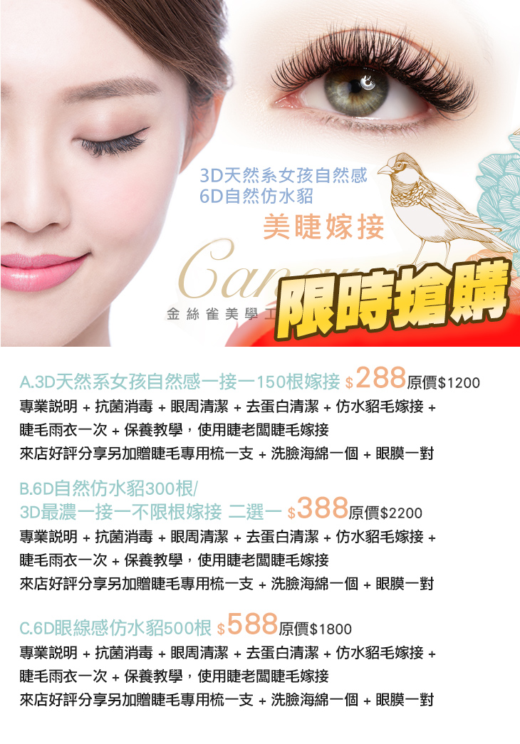 A.3D天然系女孩自然感一接一150根嫁接 / B.6D自然仿水貂300根/3D最濃一接一不限根嫁接 二選一 / C.6D眼線感仿水貂500根
