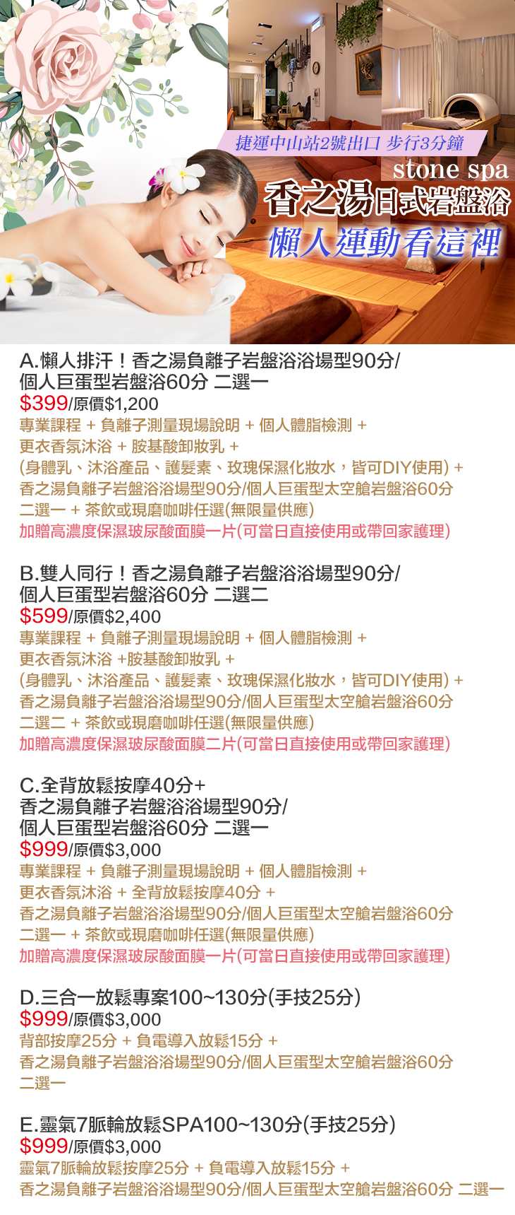 A.懶人排汗!香之湯負離子岩盤浴浴場型90分/個人巨蛋型岩盤浴60分 二選一 / B.雙人同行!香之湯負離子岩盤浴浴場型90分/個人巨蛋型岩盤浴60分 二選二 / C.全背放鬆按摩40分+香之湯負離子岩盤浴浴場型90分/個人巨蛋型岩盤浴60分 二選一 / D.三合一放鬆專案100~130分(手技25分) / E.靈氣7脈輪放鬆SPA100~130分(手技25分)