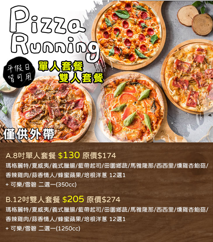 來到【Pizza Running】享受著義式經典披薩,體驗漫步在南歐的輕快與悠閒,為生活增添歡樂色彩!【Pizza Running】提供多樣以新鮮食材製作而成的美味披薩,口味超豐富,讓您享用美味餐點如走入美麗田園,清新自然的香氣給您最純粹美好的享受!