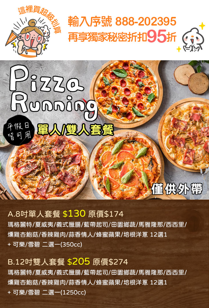 來到【Pizza Running】享受著義式經典披薩,體驗漫步在南歐的輕快與悠閒,為生活增添歡樂色彩!【Pizza Running】提供多樣以新鮮食材製作而成的美味披薩,口味超豐富,讓您享用美味餐點如走入美麗田園,清新自然的香氣給您最純粹美好的享受!