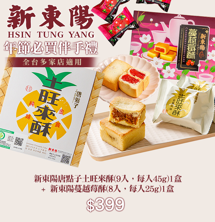 〈新東陽唐點子土旺來酥(9入,每入45g)1盒 + 新東陽蔓越莓酥(8入,每入25g)1盒〉