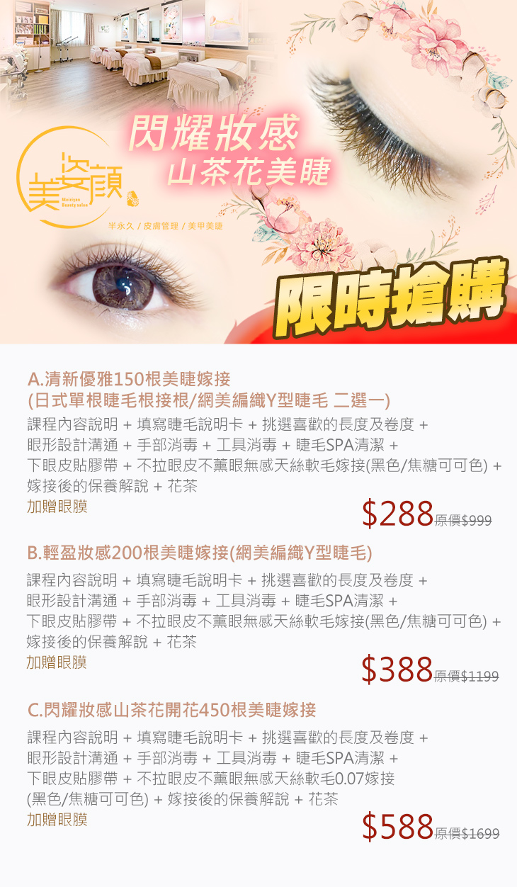 A.清新優雅150根美睫嫁接(日式單根睫毛根接根/網美編織Y型睫毛 二選一) / B.輕盈妝感200根美睫嫁接(網美編織Y型睫毛) / C.閃耀妝感山茶花開花450根美睫嫁接