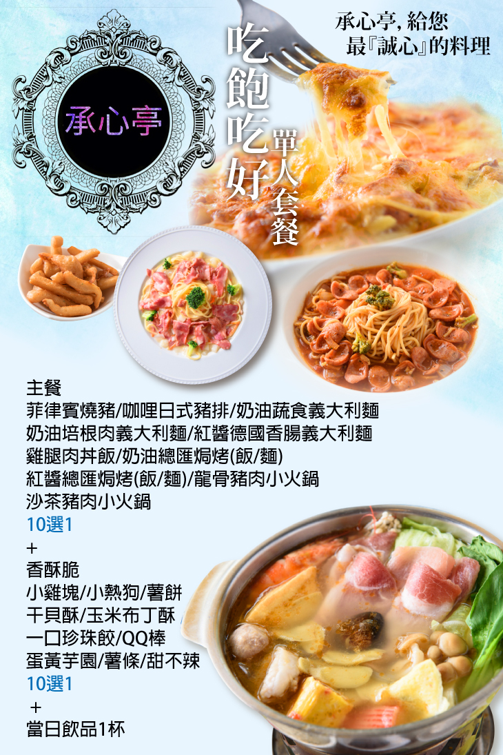 打造精緻舒適的用餐空間,每個地方都有店家用心的小巧思。嚴選食材品質,堅持採用每日新鮮食材、誠心料理每道料理,提供義大利麵、燉飯、焗烤、小火鍋、特調飲品等豐富餐飲,推出種類選擇多樣性,承心亭,給您最『誠心』的料理!