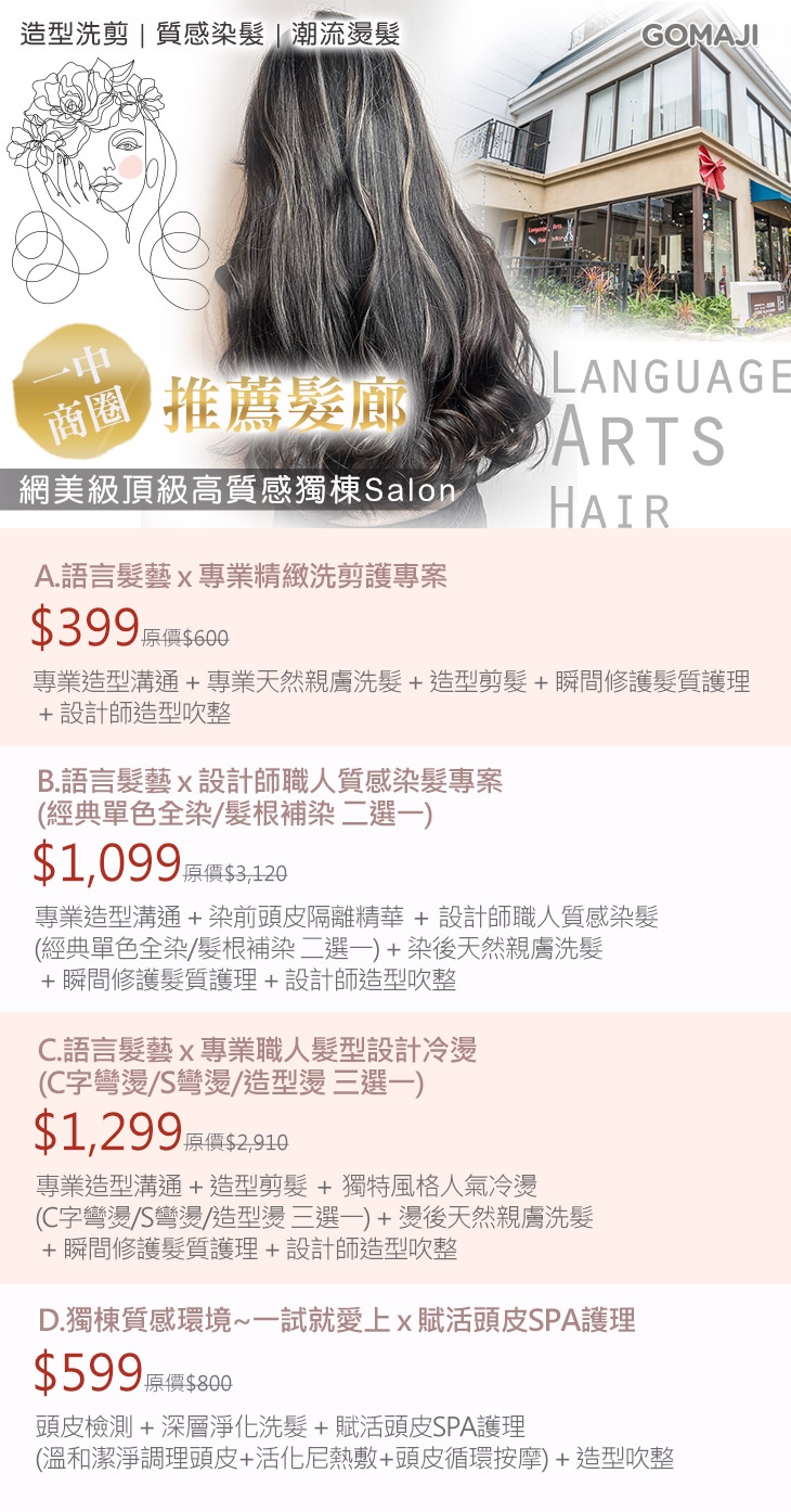A.語言髮藝 x 專業精緻洗剪護專案 / B.語言髮藝 x 設計師職人質感染髮專案(經典單色全染/髮根補染 二選一) / C.語言髮藝 x 專業職人髮型設計冷燙(C字彎燙/S彎燙/造型燙 三選一) / D.獨棟質感環境~一試就愛上 x 賦活頭皮SPA護理