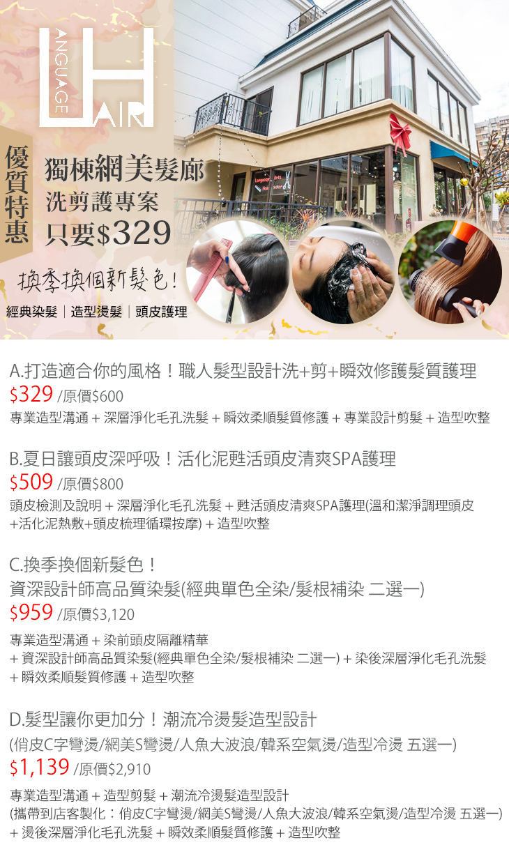A.打造適合你的風格!職人髮型設計洗+剪+瞬效修護髮質護理 / B.夏日讓頭皮深呼吸!活化泥甦活頭皮清爽SPA護理 / C.換季換個新髮色!資深設計師高品質染髮(經典單色全染/髮根補染 二選一) / D.髮型讓你更加分!潮流冷燙髮造型設計(俏皮C字彎燙/網美S彎燙/人魚大波浪/韓系空氣燙/造型冷燙 五選一)