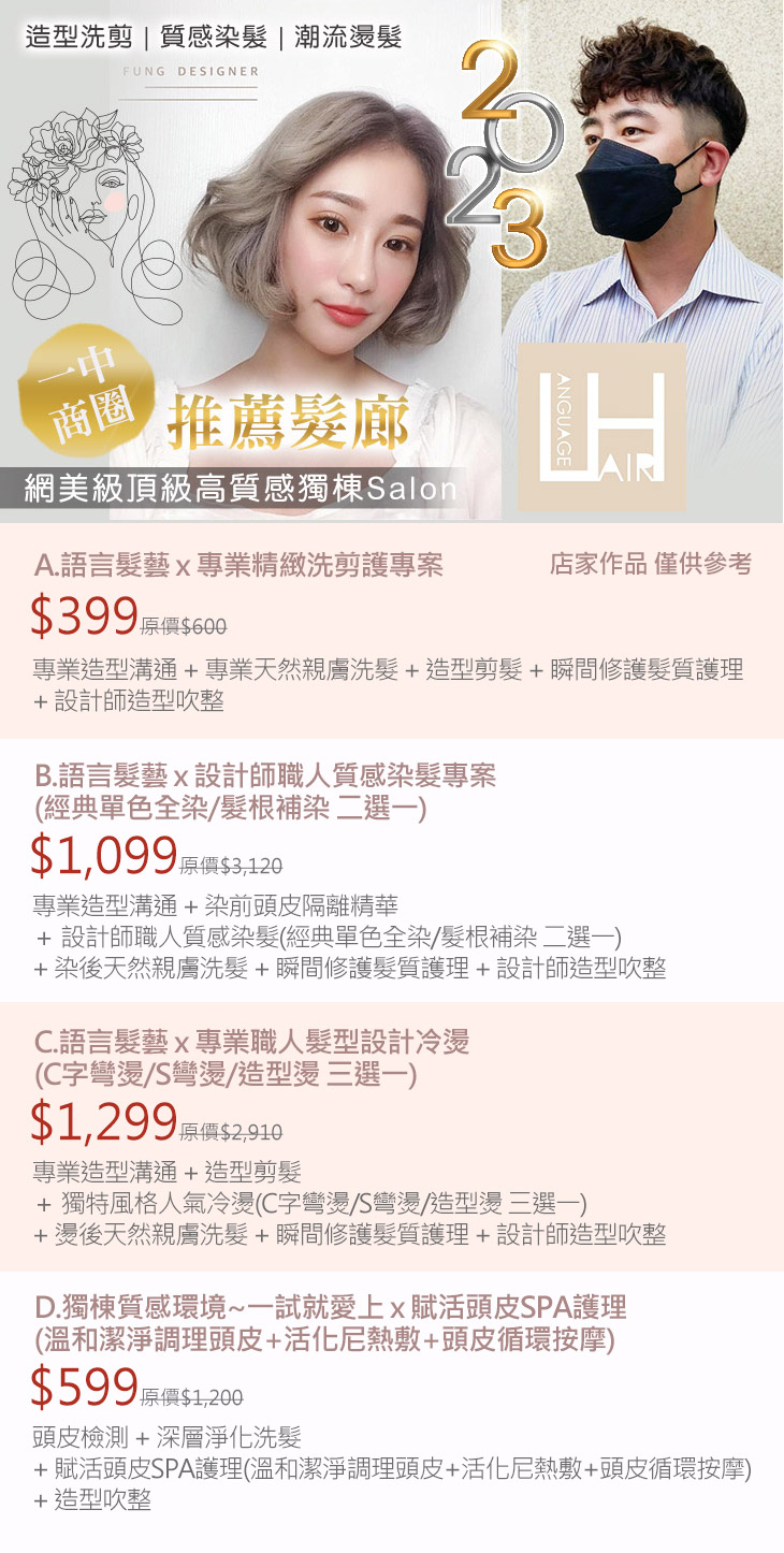 A.語言髮藝 x 專業精緻洗剪護專案 / B.語言髮藝 x 設計師職人質感染髮專案(經典單色全染/髮根補染 二選一) / C.語言髮藝 x 專業職人髮型設計冷燙(C字彎燙/S彎燙/造型燙 三選一) / D.獨棟質感環境~一試就愛上 x 賦活頭皮SPA護理(溫和潔淨調理頭皮+活化尼熱敷+頭皮循環按摩)