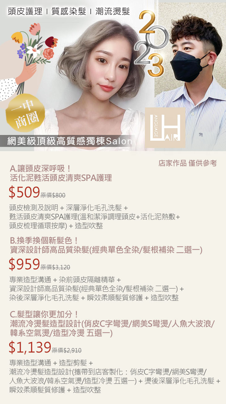 A.讓頭皮深呼吸!活化泥甦活頭皮清爽SPA護理 / B.換季換個新髮色!資深設計師高品質染髮(經典單色全染/髮根補染 二選一) / C.髮型讓你更加分!潮流冷燙髮造型設計(俏皮C字彎燙/網美S彎燙/人魚大波浪/韓系空氣燙/造型冷燙 五選一)