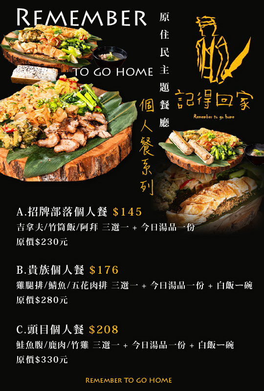 C.頭目個人餐:鮭魚腹/鹿肉/竹雞 三選一 + 白飯一碗 + 今日湯品一份