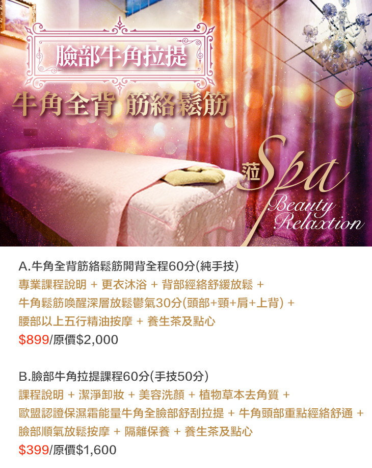 首先為您清潔去角質,除去煩人的髒污,再使用牛角進行舒刮及拉提,當然少不了頭部及臉部的按摩,除了好好愛護您的寶貝臉蛋之外,也讓您能夠放鬆心情,展現自信迷人的魅力,整個人活力滿滿!