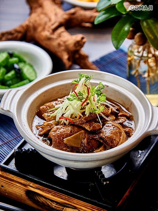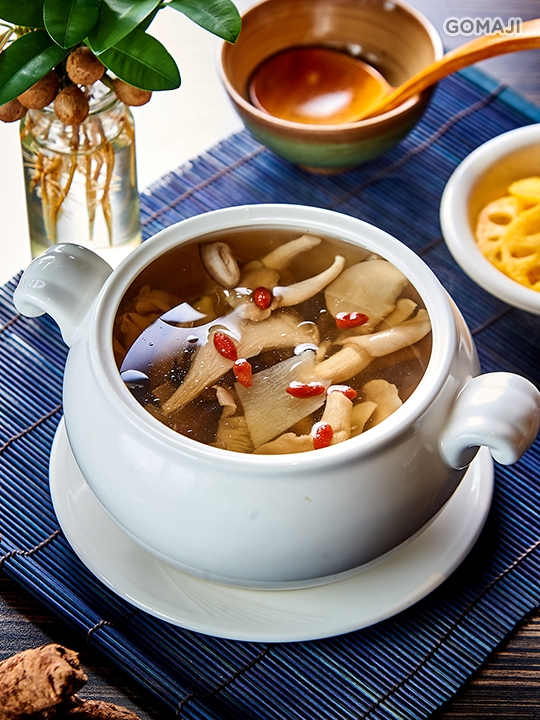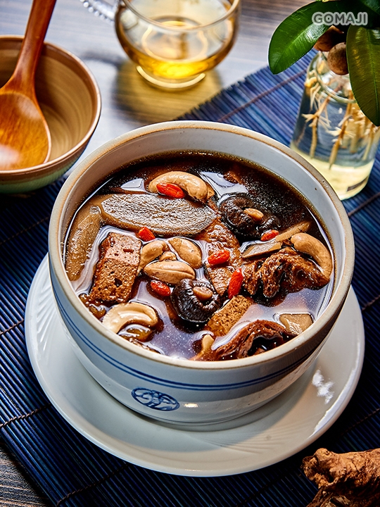 顏色金黃的黃茸又稱黃木耳,因其形似人腦,又稱腦耳,帶有淡淡的桂花香味又名桂花耳。此道湯品以十全藥膳作湯底,加入黃茸、腰果、牛蒡,呈現多層次滋味,而且滋補又可口。