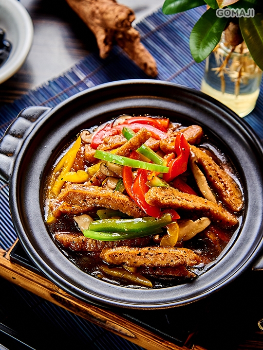 金黃酥脆的素雞排切成條狀,搭配五彩繽紛的時蔬一起盛裝在炙熱的陶盤上,再淋上特調黑楜椒醬,爆發出濃郁芬芳的香氣。