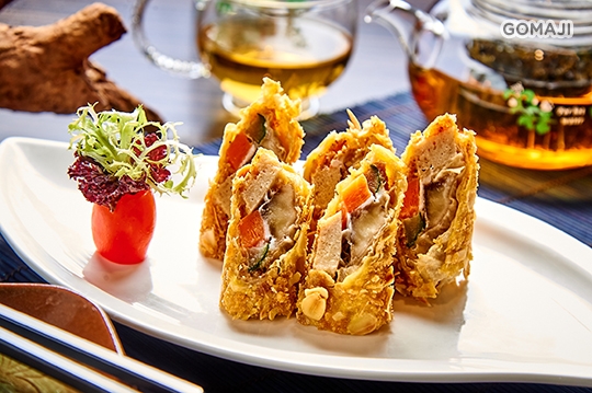 新鮮時蔬及香蕉,搭配美妙滋味的素黃金鴨,再淋上美乃滋提味,外面再裹上杏仁麵包粉酥炸,外層酥鬆脆、內裡多汁開胃,也是美味的開胃菜。