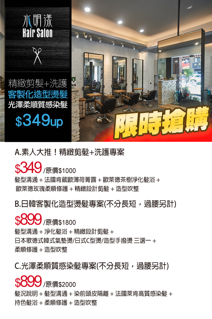 A.素人大推!精緻剪髮+洗護專案 / B.日韓客製化造型燙髮專案(不分長短,過腰另計) / C.光澤柔順質感染髮專案(不分長短,過腰另計)