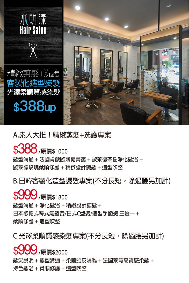 A.素人大推!精緻剪髮+洗護專案 / B.日韓客製化造型燙髮專案(不分長短,除過腰另加計) / C.光澤柔順質感染髮專案(不分長短,除過腰另加計)