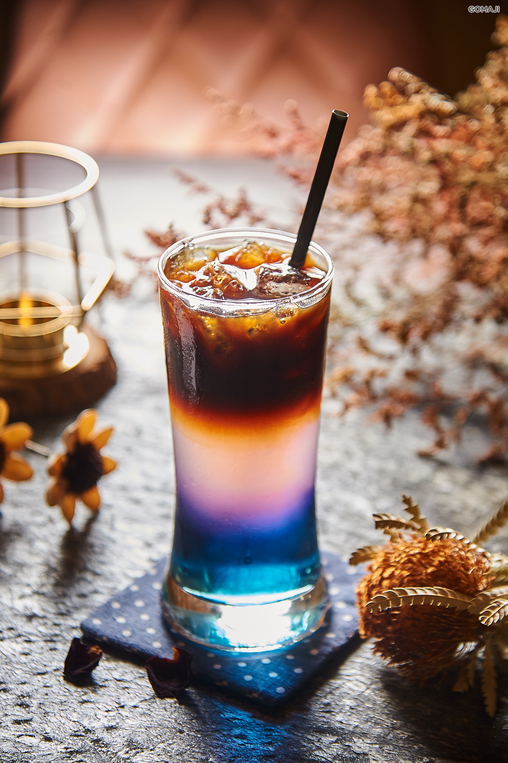 靜謐的午後,點上一杯接骨木檸香美式,褐、紫、藍三種色彩完美融合,搭配玻璃杯的鏡面光感更顯美麗,加入接骨木於底層中提升香氣,令美式咖啡不那麼單調,添了多種清甜香氣,口感滑順溫潤、酸甜回甘,彷彿置身於異國的浪漫風情。
