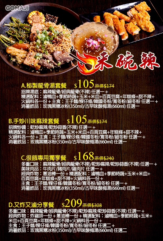 多重口味:麻辣龍骨/經典龍骨(不辣)/乾炒麻辣/乾炒蒜香(不辣) 任選一 + 經典炸物:炸雞排一份 + 蔥油棒一份 + 精選配料:滷鴨血+季節時蔬+玉米+米血+百頁豆腐+年糕條+甜不辣+火鍋料各一份 + 主食:王子麵/粿仔條/韓國冬粉/寬冬粉/細冬粉 任選二 + 消暑飲品:玫瑰黑糖冰粉(350ml)/古早味酸梅湯(660ml) 任選二