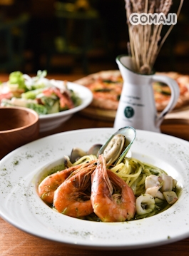青醬海鮮義大利麵(左)