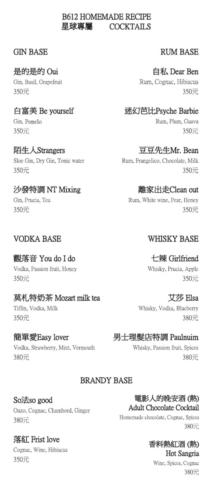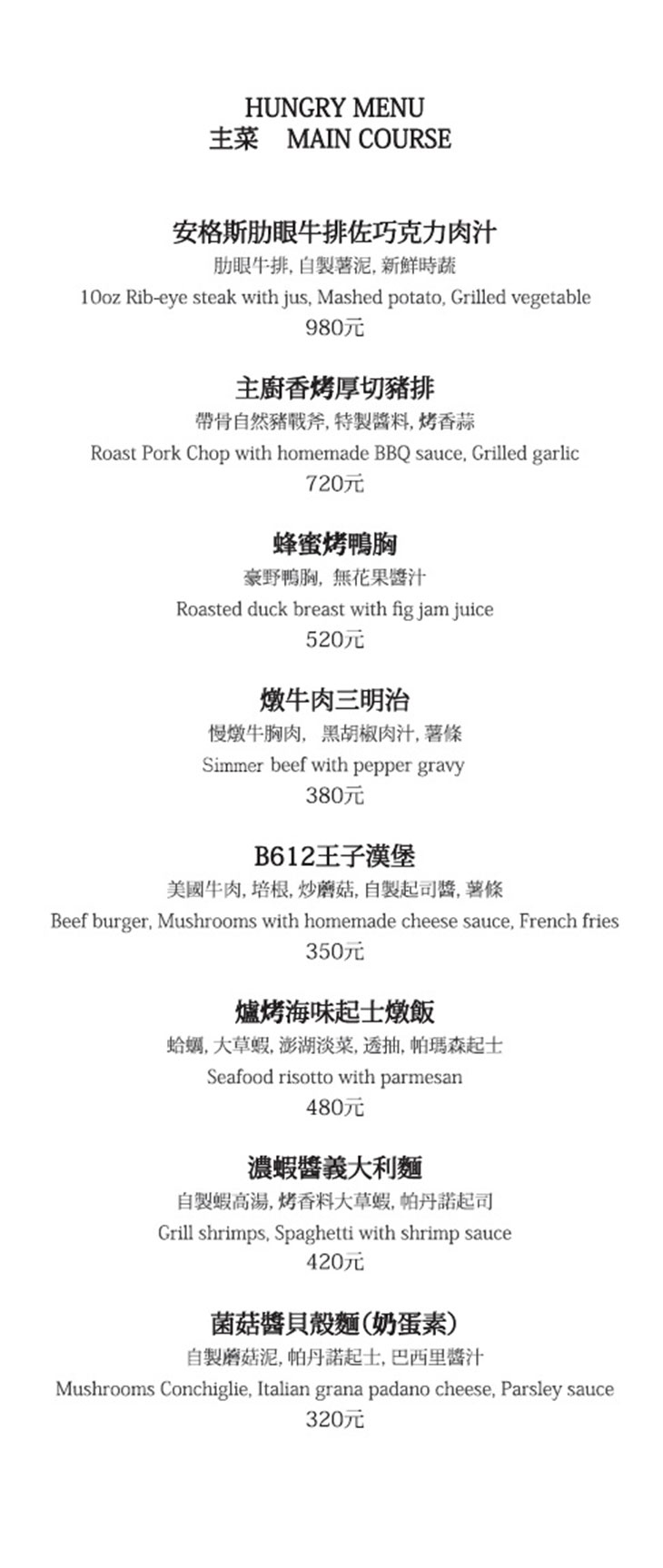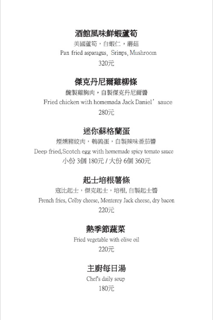 特別推薦:迷你蘇格蘭蛋、肉汁香腸焗烤馬鈴薯泥、酒館炒蘑菇、燉牛肉三明治、濃蝦醬義大利麵、蜂蜜烤鴨肉、莓果克拉美緹、調酒類:落紅、cleanin out、觀落音