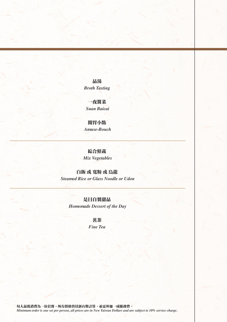 ※ 菜色內容依季節時令調整,實際菜色、價目依現場提供為主。