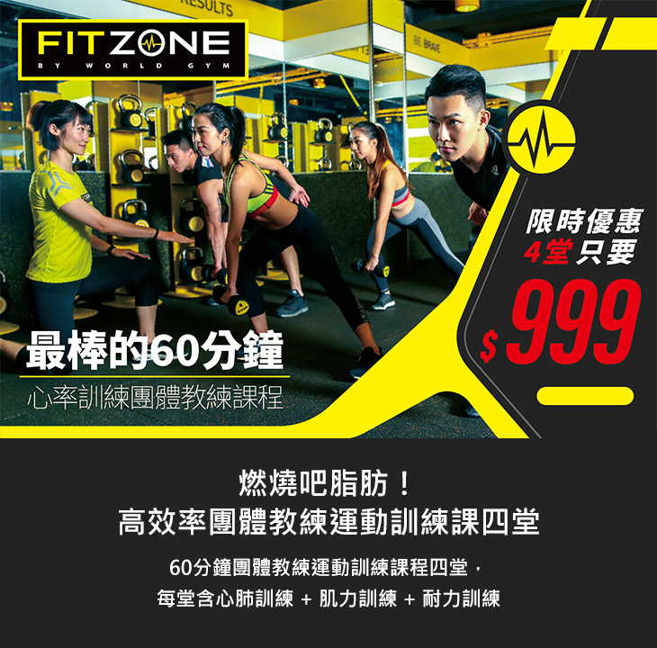 World Gym全新運動型態品牌─FITZONE,透過科學研究設計,並結合獨家MYZONE科技監測,規劃出全台首見的心率訓練團體教練課程!只要60分鐘,便能有效地幫助您達到瘦身、減重、雕塑身材的效果!