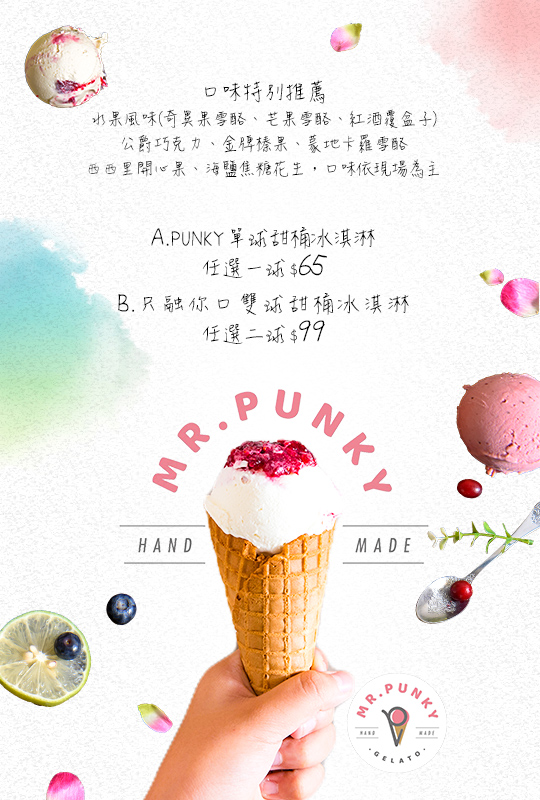 任選二球,口味特別推薦:水果風味(奇異果雪酪、芒果雪酪、紅酒覆盆子)、公爵巧克力、金牌榛果、蒙地卡羅雪酪、西西里開心果、海鹽焦糖花生,口味依現場為主