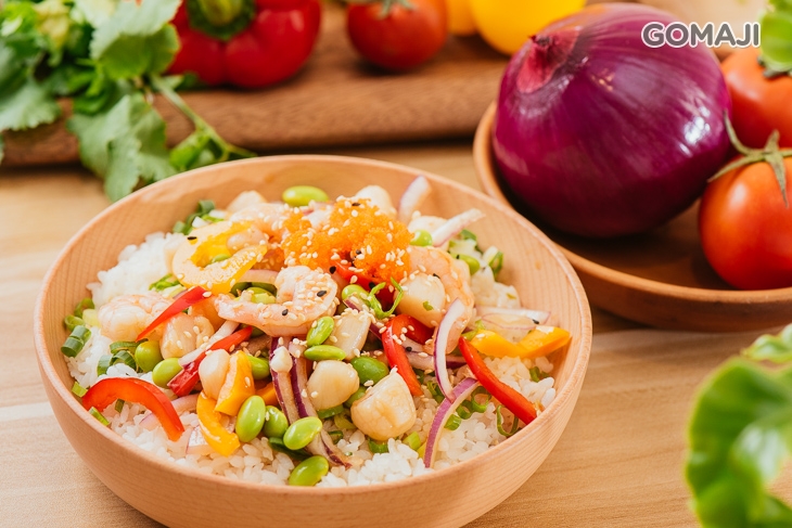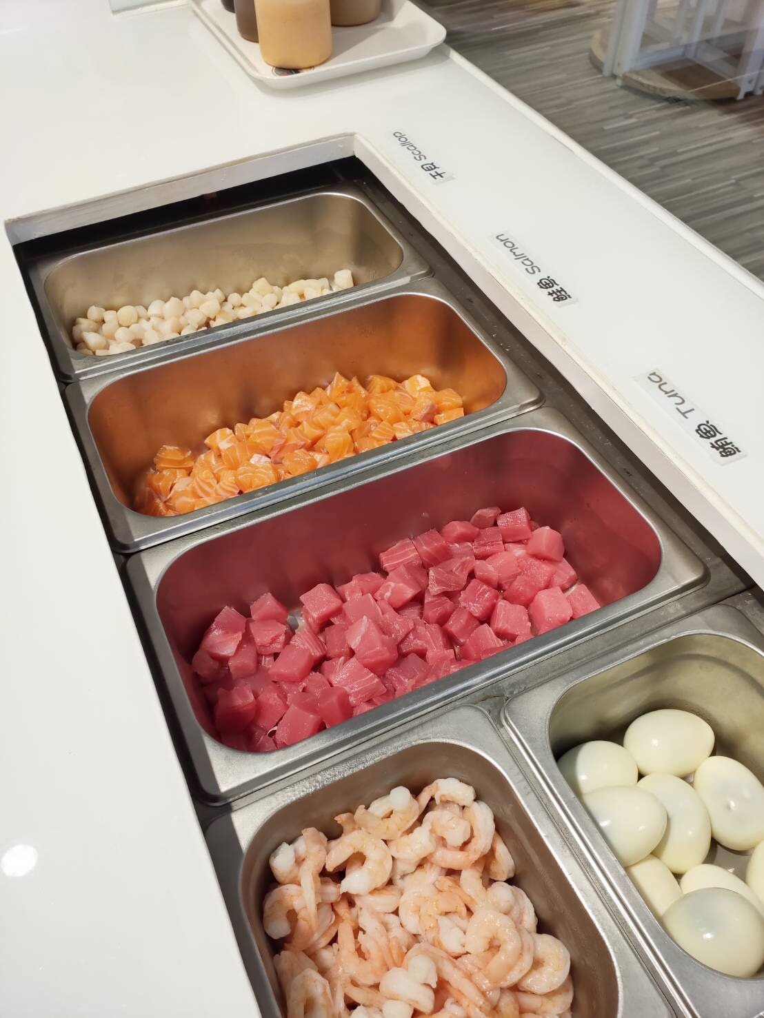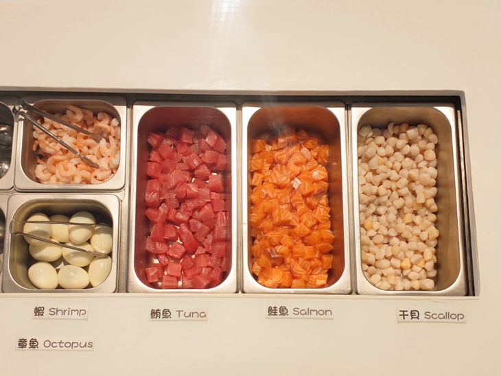 ✿STEP2.選擇每日必須的能量來源-蛋白質!(可選各式新鮮鮭魚、 鮪魚、干貝、蝦雞肉或蛋),接著將配料鋪滿於主食上方,色澤繽紛且新鮮美味
