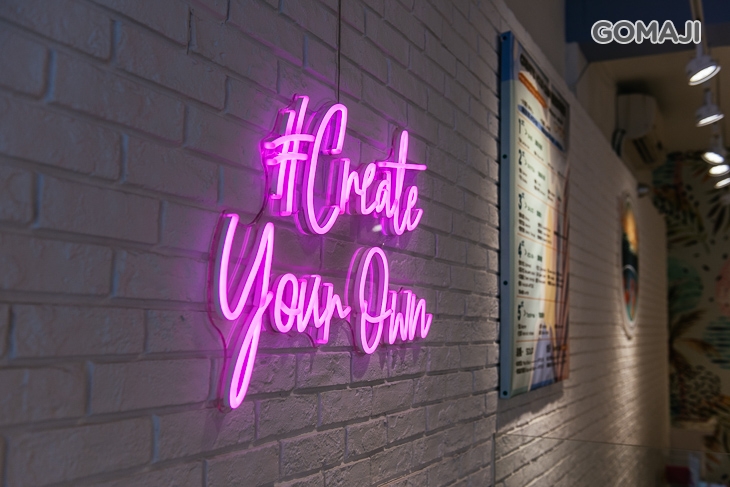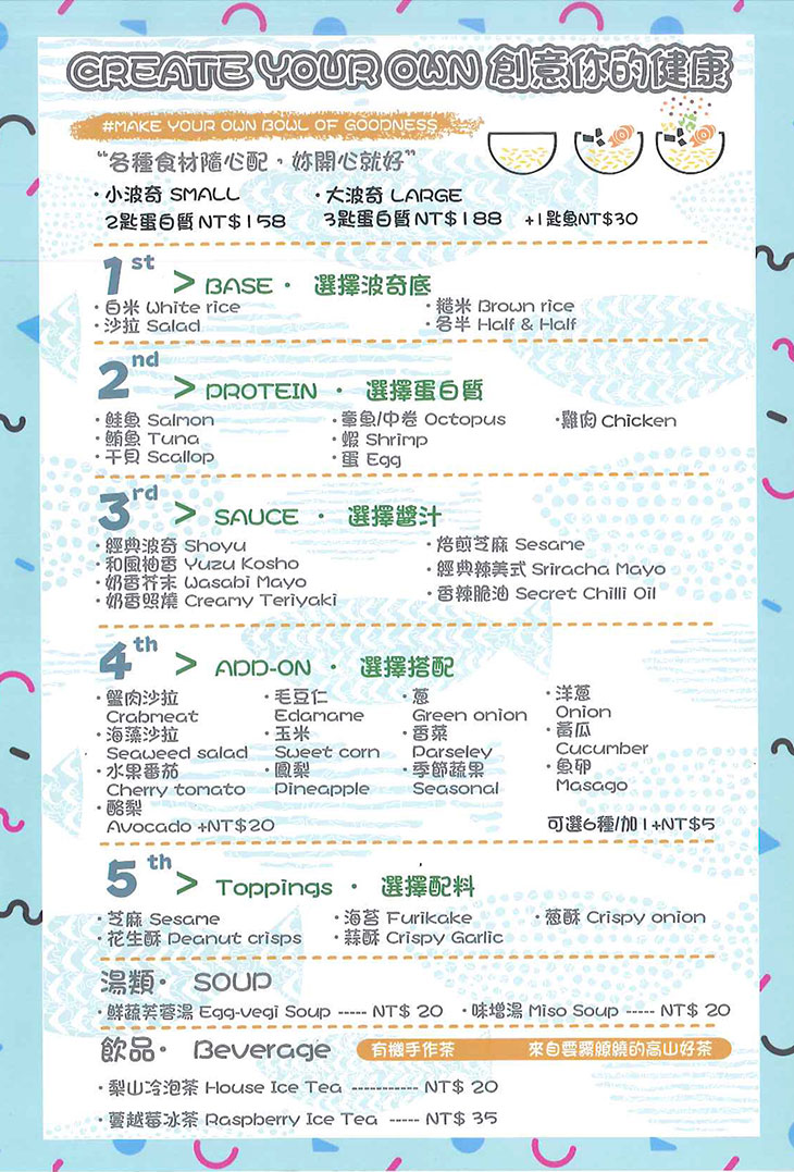 擁有符合台灣人味蕾的8種醬汁,搭配各種魚肉、雞肉、蛋及豐富配料,如同餐廳牆上的標語「Create Your Own」(創意由你),沒有定型菜單,全憑麻吉的自由搭配創造專屬於妳/你的波奇料理,首先選擇主餐(白飯、糙米或沙拉),接著選擇「蛋白質」(各種魚肉、雞肉或蛋),再挑選蔬果、配料與醬汁,一碗繽紛多彩的獨特波奇料裡就完美誕生了!