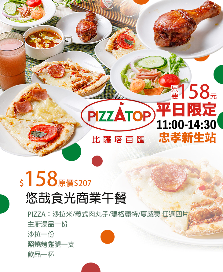 近捷運忠孝新生站1號出口、三創生活園區7樓!為木石系列餐廳之一的【PIZZA TOP 比薩塔百匯】,餐點提供以義式窯烤披薩為主。針對披薩,無論是內餡的組合、風味的調配、窯烤的時間,還是口感的拿捏,每一個環節都來自經驗的累積與專業的呈現。另外搭配其他義式風味餐點,湯品、沙拉到甜點,運用不同組合給您前所未有的佳餚饗宴!好吃、美味、健康、平價,讓人一想到披薩,就想到〝PIZZA TOP〞,本次與夠麻吉攜手推出超值專屬優惠,機會難得,想大啖美食就趁這波!