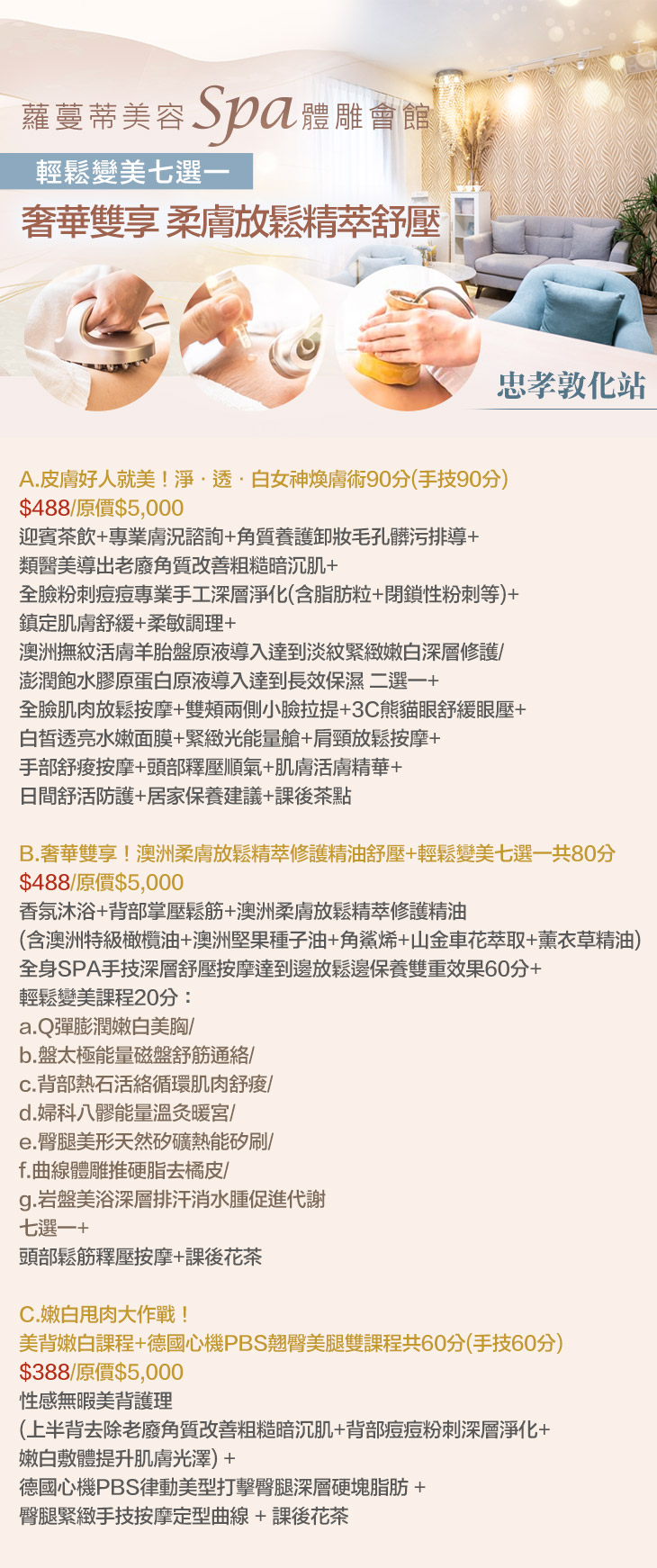 A.皮膚好人就美!淨‧透‧白女神煥膚術90分(手技90分) / B.奢華雙享!澳洲柔膚放鬆精萃修護精油舒壓+輕鬆變美七選一共80分 / C.嫩白甩肉大作戰!美背嫩白課程+德國心機PBS翹臀美腿雙課程共60分(手技60分)