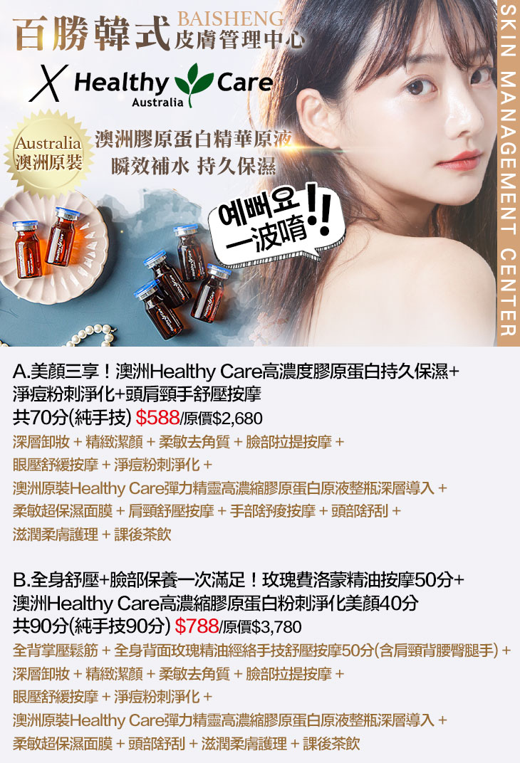 A.美顏三享!澳洲Healthy Care高濃度膠原蛋白持久保濕+淨痘粉刺淨化+頭肩頸手舒壓按摩共70分(純手技) / B.全身舒壓+臉部保養一次滿足!玫瑰費洛蒙精油按摩50分+澳洲Healthy Care高濃縮膠原蛋白粉刺淨化美顏40分共90分(純手技90分)